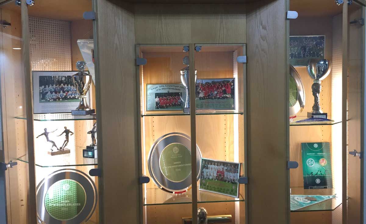 In der Sportschule beeindruckten sie sich zuerst im Sporthotel mit Erinnerungsstücken an große Zeiten, darunter Trikots der spanischen Nationalmannschaft mit Autogrammen, Wimpel, zahlreiche Pokale und Bilder der westfälischen Fußballgeschichte.