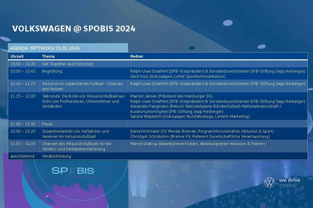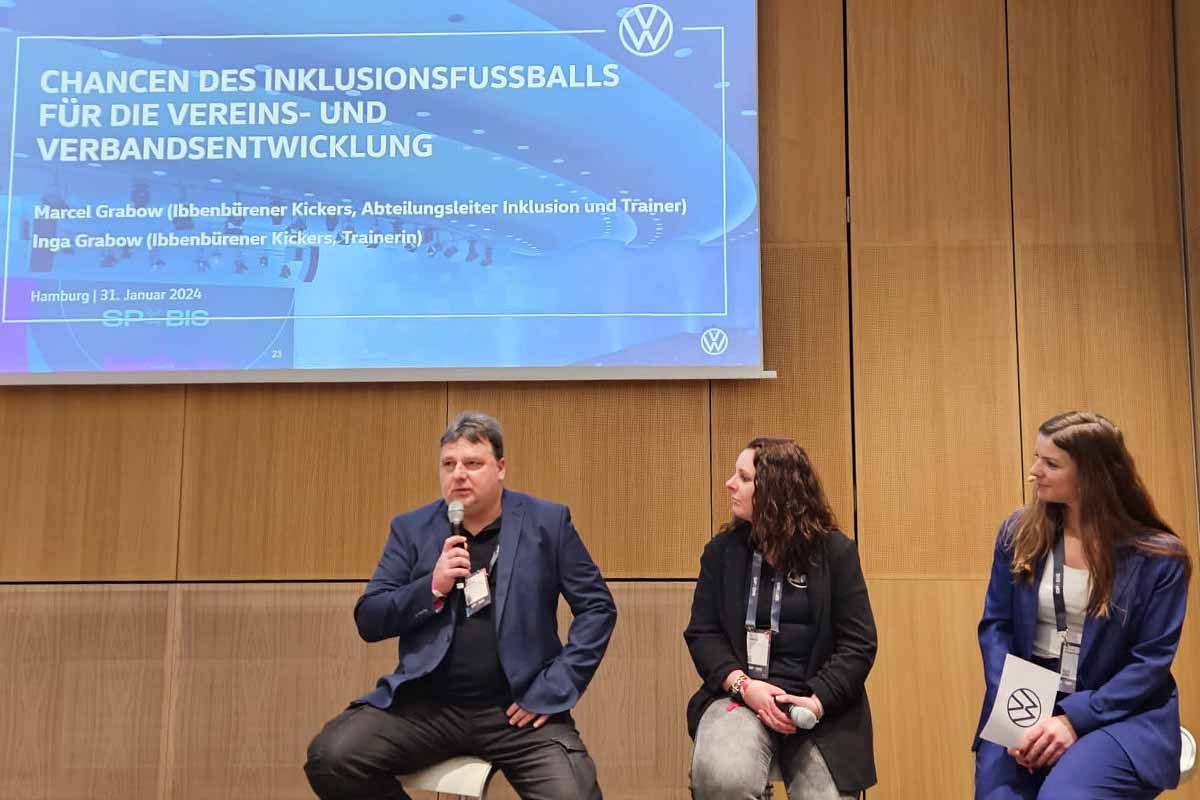 Für die größte Sportbusiness-Veranstaltung in Europa organisierten der Deutsche Fußball-Bund (DFB) und sein Mobilitätspartner Volkswagen bereits zum fünften Mal einen auf die DFB-Landesverbände zugeschnittenen Workshop. Die DFB-Stiftung Sepp Herberger und Volkswagen haben uns zu dieser besonderen Gelegenheit eingeladen: Auf der Spobis 2024 dürfen wir als Best-Practice-Beispiel über die "Chancen des Inklusionsfußballs für die Vereins- und Verbandsentwicklung" sprechen. Diese Einladung haben wir gerne angenommen, und am 30. Januar 2024 machten sich Inga und Marcel voller Vorfreude auf den Weg nach Hamburg.