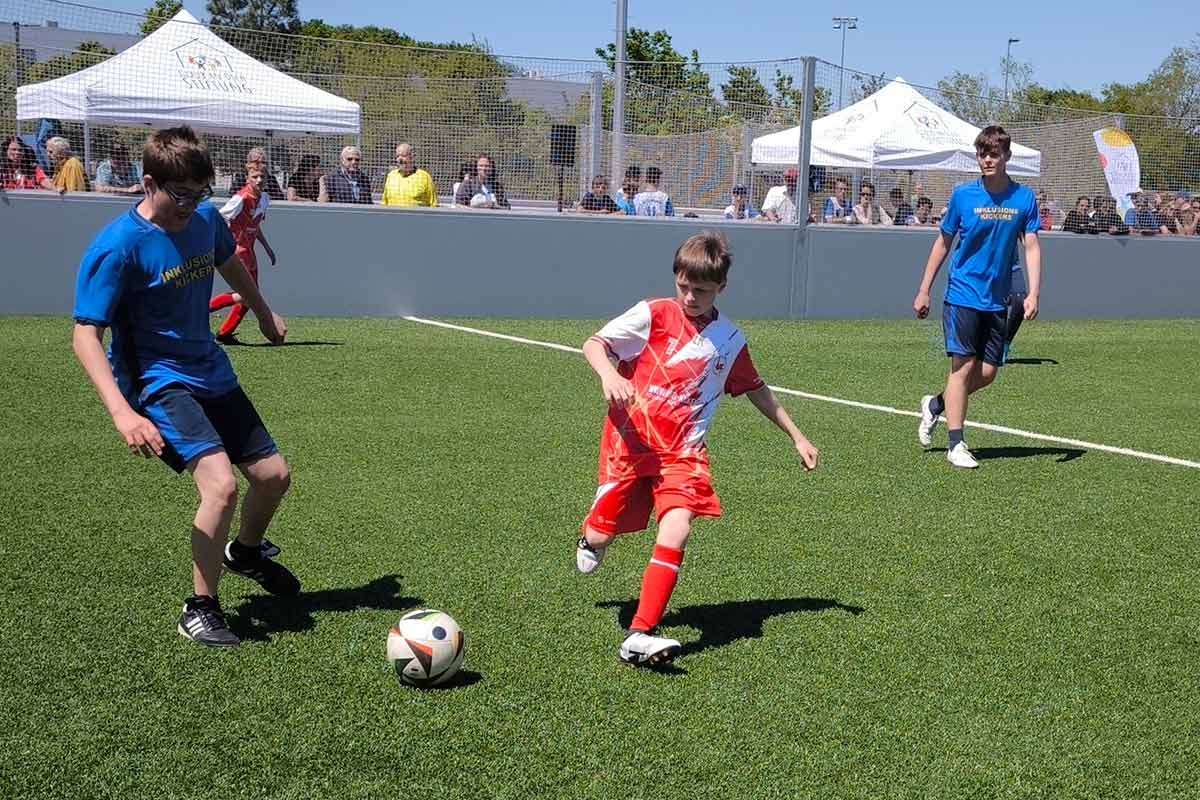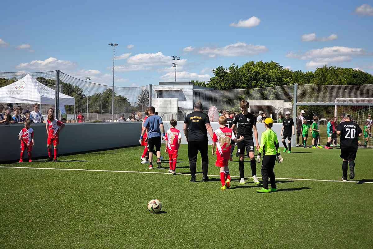 Doch Joshua und Lina blieben nicht nur für die Begrüßung – sie nahmen sich den ganzen Vormittag Zeit, schauten sich viele der Spiele an, sprachen mit Kindern, Eltern und Betreuern – und mittendrin: Timm und Ole und Henry aus unserem Team. Beim Gespräch mit den beiden fiel Joshua besonders ein Spieler auf: „Gib dem Zehner den Ball, der macht alle nass und schießt das entscheidende Tor!“ – gemeint war unser Nico, der mit seinem Einsatz und Spielwitz auf dem Platz glänzte.