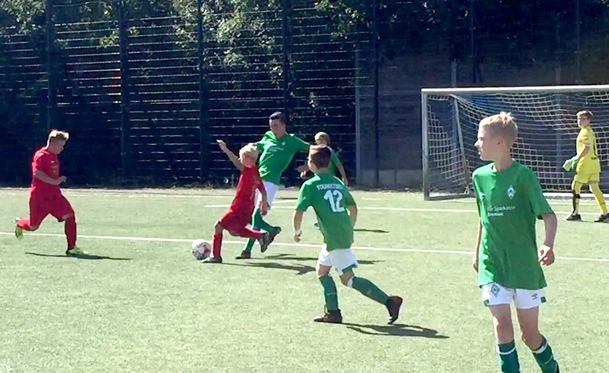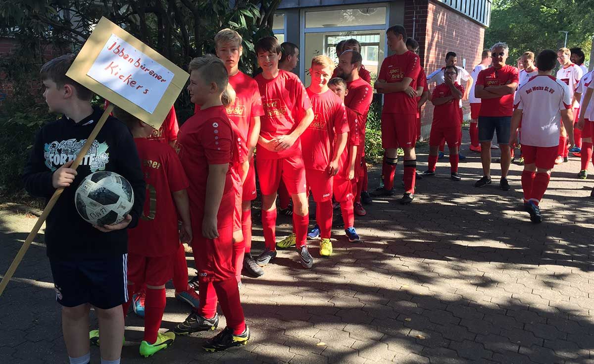 Nach der freundlichen Begrüßung und den Worten der Sponsorin der Wildemann-Stiftung ging es direkt auf den Platz. Unsere beiden Teams zeigten von Anfang an Spielfreude und Fußballbegeisterung. Die "Kleinen" waren zuerst etwas nervös gegen Werder Bremen, aber die Aufregung verflog kurz nach dem Anpfiff, und alle Ibb-Kickers hatten nur ein Ziel: das Tor von Werder Bremen.