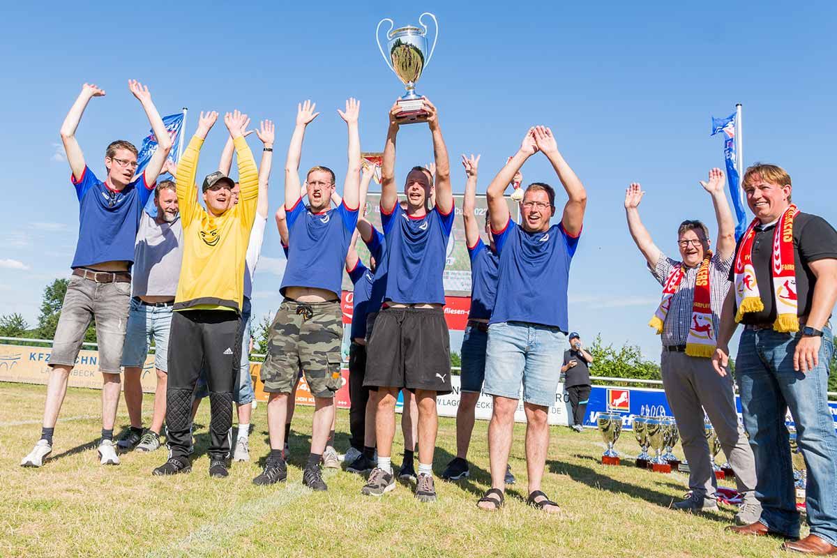 Nachdem alle Gastvereine ihre Ehrung erhalten hatten, stellten sie sich zum Spalier für die Ibbenbürener Kickers auf und applaudierten den Gastgebern. Unter dem donnernden Applaus aller Beteiligten durchliefen die Ibbenbürener Kickers den Spalier, streckten unter lautem Jubel den Pokal in den Himmel und ließen sich von allen Beteiligten feiern. Im Anschluss gab es für Trainer Marcel Grabow noch die Bierdusche. Abschließend sorgte unser DJ Jörg mit fetten Beats und Tanzmusik für Stimmung am Vereinsheim.