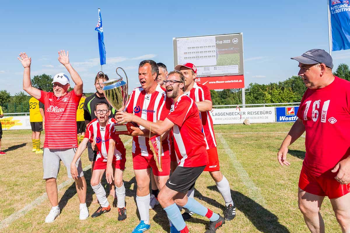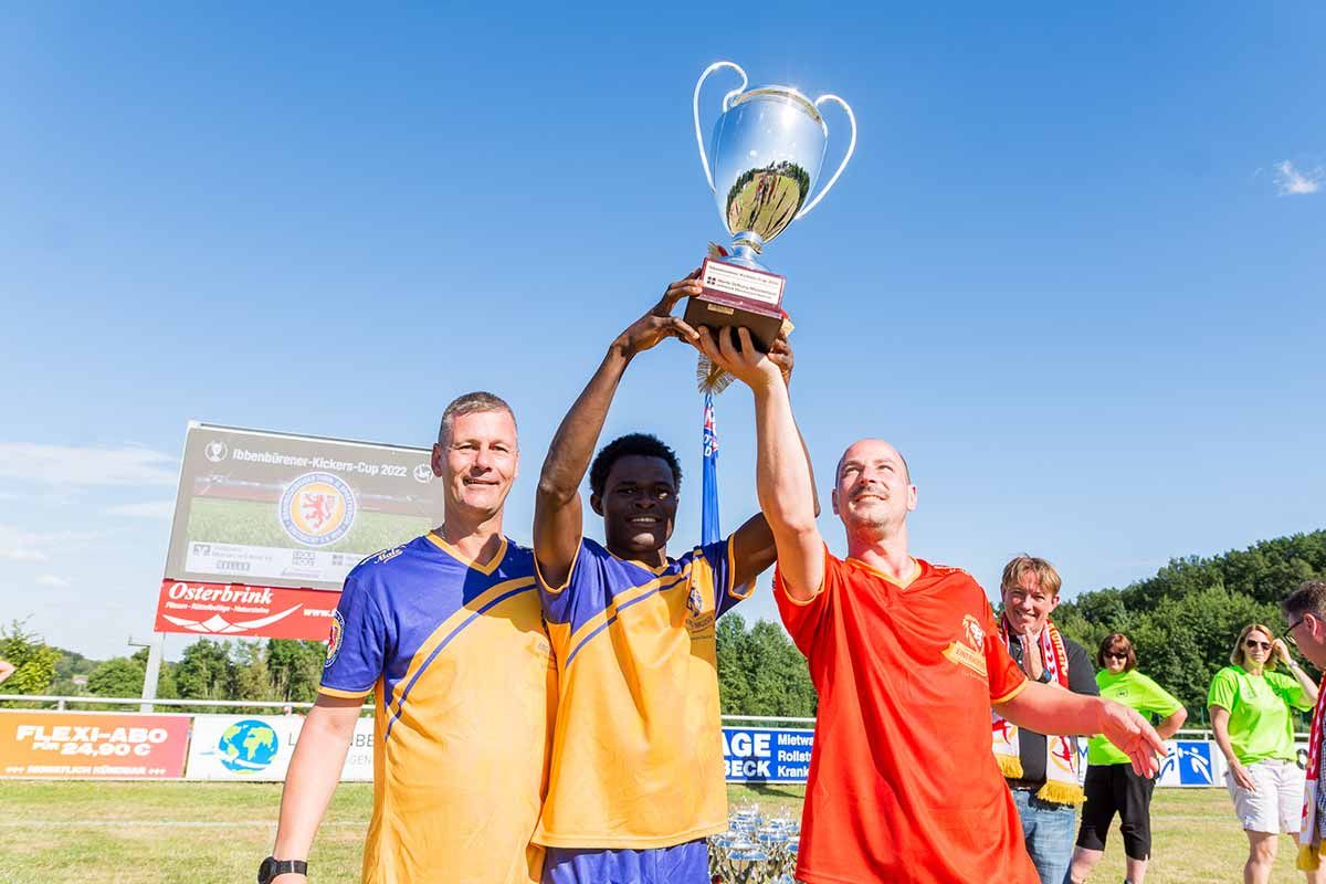 Die Mannschaften durchliefen erschöpft aber strahlend den Spalier. Vor der Leinwand, wo das jeweilige Vereinslogo aufleuchtete, erhielten sie Medaillen für jeden Spieler, einen Ibbenbürener Kickers Wimpel und einen 60 cm hohen Pokal, der dem Champions-League-Pokal sehr ähnelte. Sie streckten ihn stolz in die Höhe und feierten lautstark.
