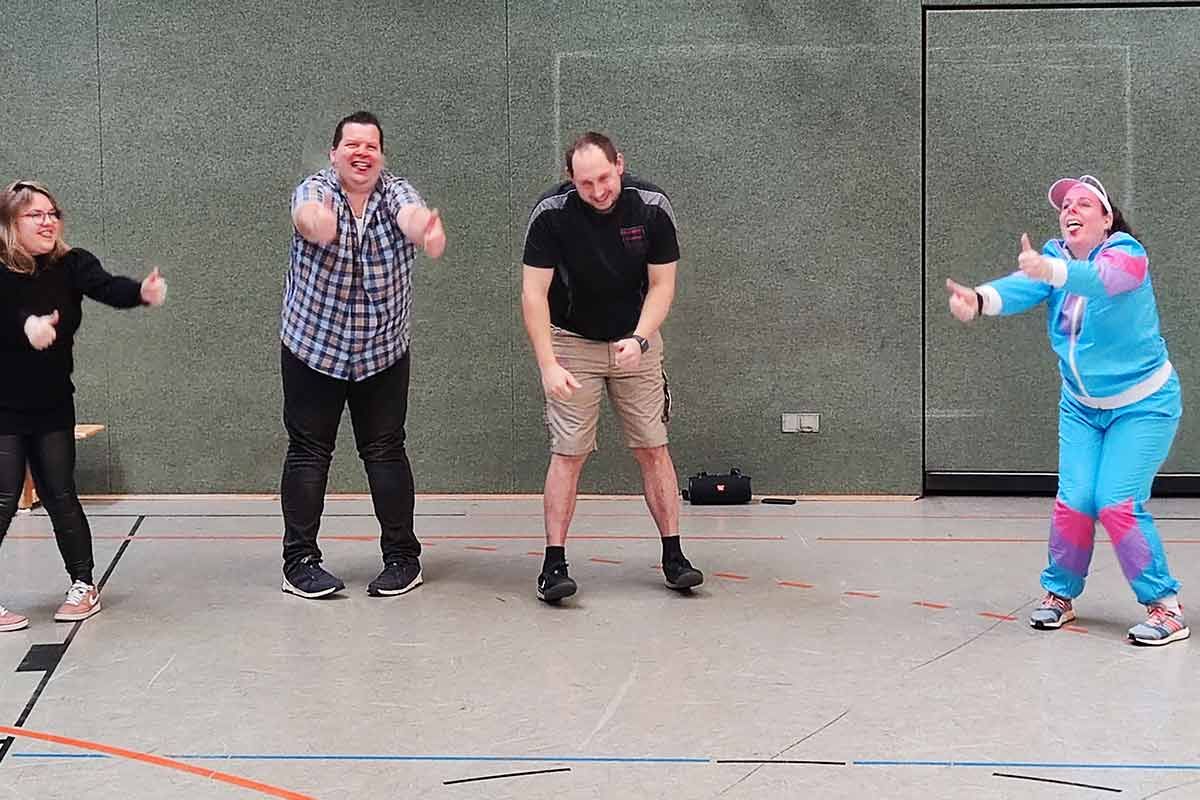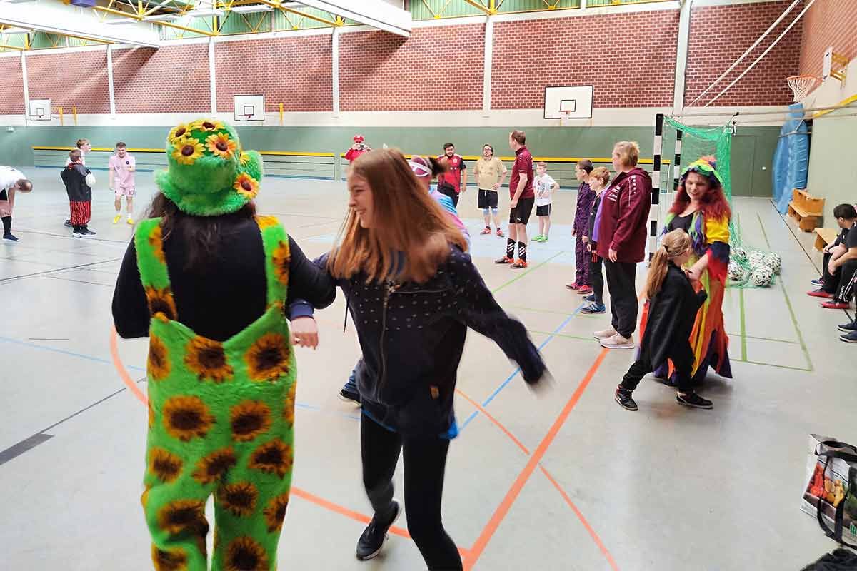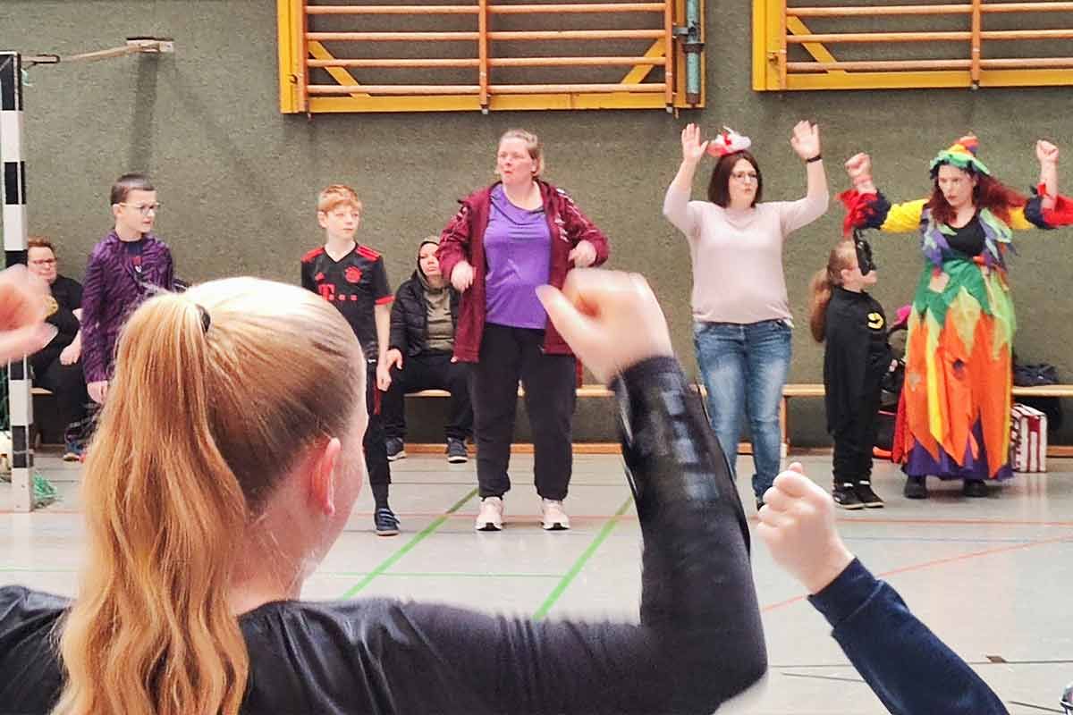 Mit einer ordentlichen Portion Karnevalsmusik starteten wir unser Warm-up, um in die richtige Stimmung zu kommen. Natürlich durfte dabei auch die traditionelle Polonaise nicht fehlen! Hand in Hand zogen wir durch die Halle und verbreiteten gute Laune.
