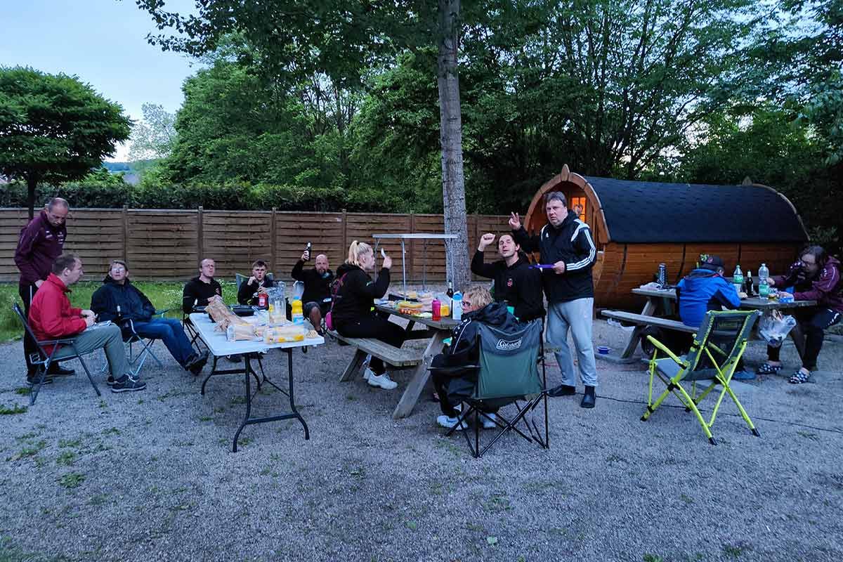 Mit zwei gemieteten Bullys und 17 Spielerinnen und Spielern sowie einigen Eltern machten wir uns am Freitag, den 17. Mai 2024, frühmorgens auf den Weg. Um 8:00 Uhr starteten wir in Ibbenbüren und kamen mit ein paar kleinen Pausen gegen 18:00 Uhr in Lörrach an. Die Übernachtung in Schlaf-Fässern und Zelten auf dem Campingplatz war ein Highlight für die Gemeinschaft. Bei gegrilltem Essen und kühlen Getränken saßen wir lange zusammen, unterhielten uns und genossen die entspannte Atmosphäre. Dieser gemeinsame Abend war noch schöner als im letzten Jahr.