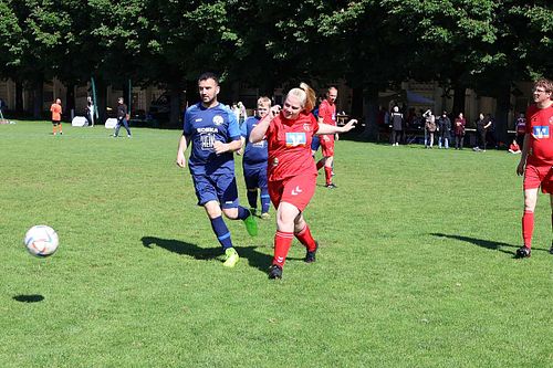 Auf sechs Feldern gleichzeitig wurde gespielt, und nach dem Anpfiff dauerte es nicht lange, bis die ersten Jubelschreie zu hören waren. Tore fielen auf allen Plätzen, und wir waren mittendrin. Nach jedem Spiel gab es kurze Pausen, bevor wir wieder aufs Feld durften. Zur Mittagspause gab es leckere vegane Spaghetti Bolognese mit frischem Salat. Die Stimmung war hervorragend, und alle freuten sich auf die nächsten Spiele. Überall trafen wir Freunde und bekannte Gesichter. Besonders schön war es, Lea von der Scort-Foundation wiederzusehen. Sie nahm sich viel Zeit, um mit uns über unsere bisherigen und zukünftigen Projekte zu sprechen.