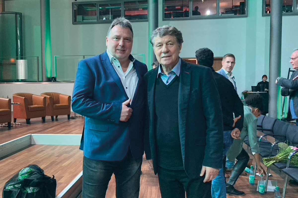 Zu Gast in der Hauptstadtrepräsentanz der Deutschen Telekom AG waren nicht nur unsere beiden bekannten Gesichter der Ibbenbürener Kickers, Marcel Grabow und Paul Schomaker, sondern auch prominente Persönlichkeiten aus Fußball, Politik und Gesellschaft. Dieses besondere Event wurde live auf #dabeiTV, bei MagentaTV und auf DFB-TV übertragen. Und die Delegation des DFB war in voller Stärke vertreten: Präsident Bernd Neuendorf, Vizepräsident Ronny Zimmermann, Generalsekretärin Heike Ullrich, Schatzmeister Stephan Grunwald sowie die Vizepräsidenten Prof. Dr. Silke Sinning und Ralph-Uwe Schaffert waren alle dabei. Auch bekannte Gesichter wie Philipp Lahm, Otto Rehhagel, Reinhold Beckmann, Christine Lambrecht, Markus Hörwick und Michael Herberger, Urgroßneffe von Sepp Herberger, waren vor Ort. Dazu gesellten sich Felix Kroos, die ehemaligen Nationalspielerinnen Navina Omilade und Ariane Hingst sowie Theresa Merk, die Cheftrainerin der Frauenmannschaft des SC Freiburg.
