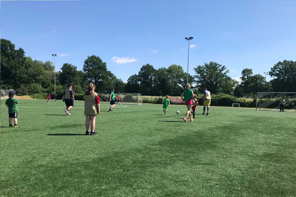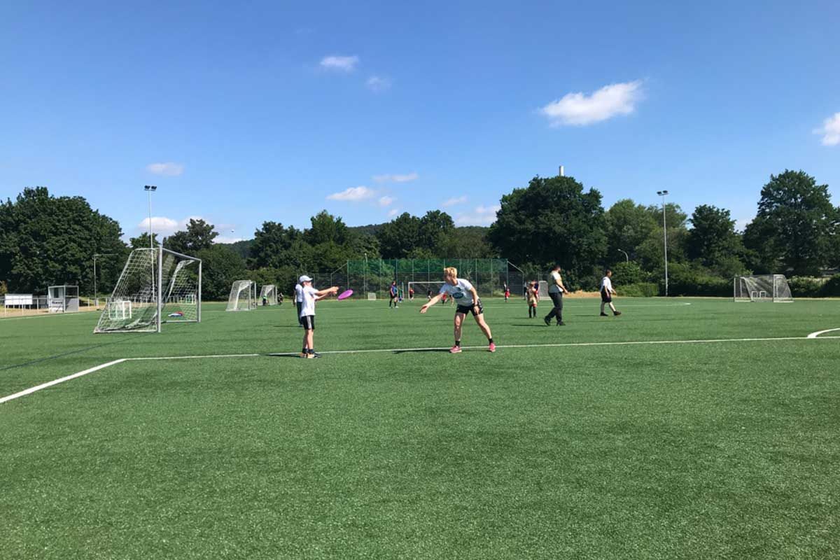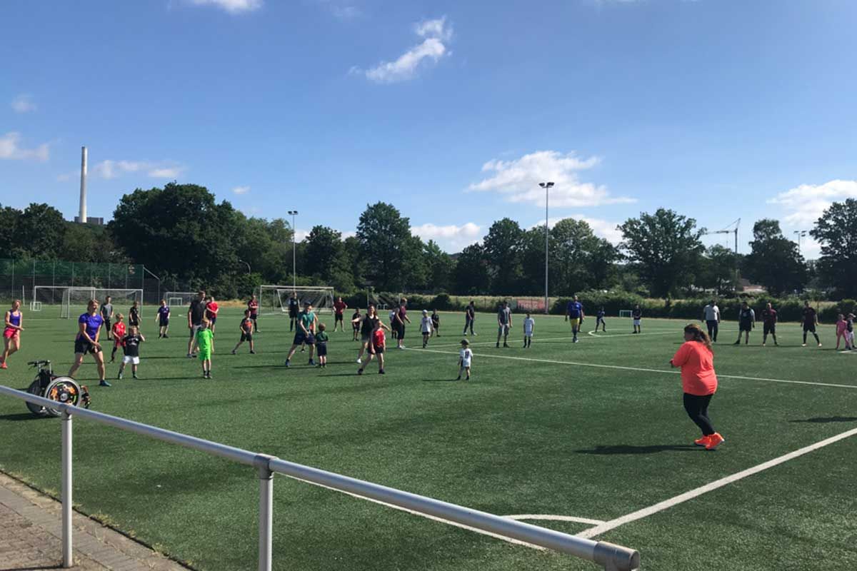 Als Überraschungsgast haben wir Sabrina Freinatis eingeladen, eine Zumba®-Zin™-Trainerin. Sie startete das Programm mit einem gemeinsamen Warm-Up für alle. Nachdem sich etwa 60 Teilnehmer auf dem Platz verteilt hatten, schallte laute Musik über das Gelände, und los ging's. Alle haben so gut mitgemacht, wie sie konnten, und es hat allen riesigen Spaß gemacht.