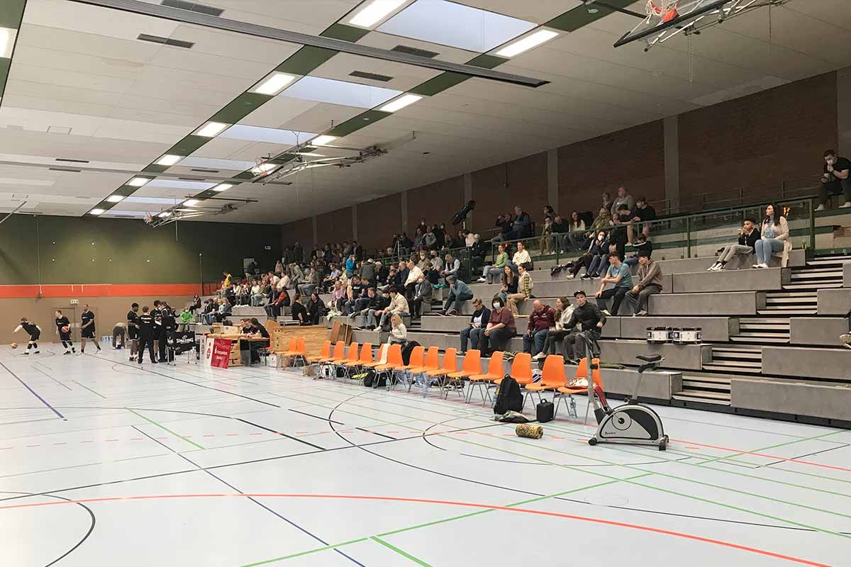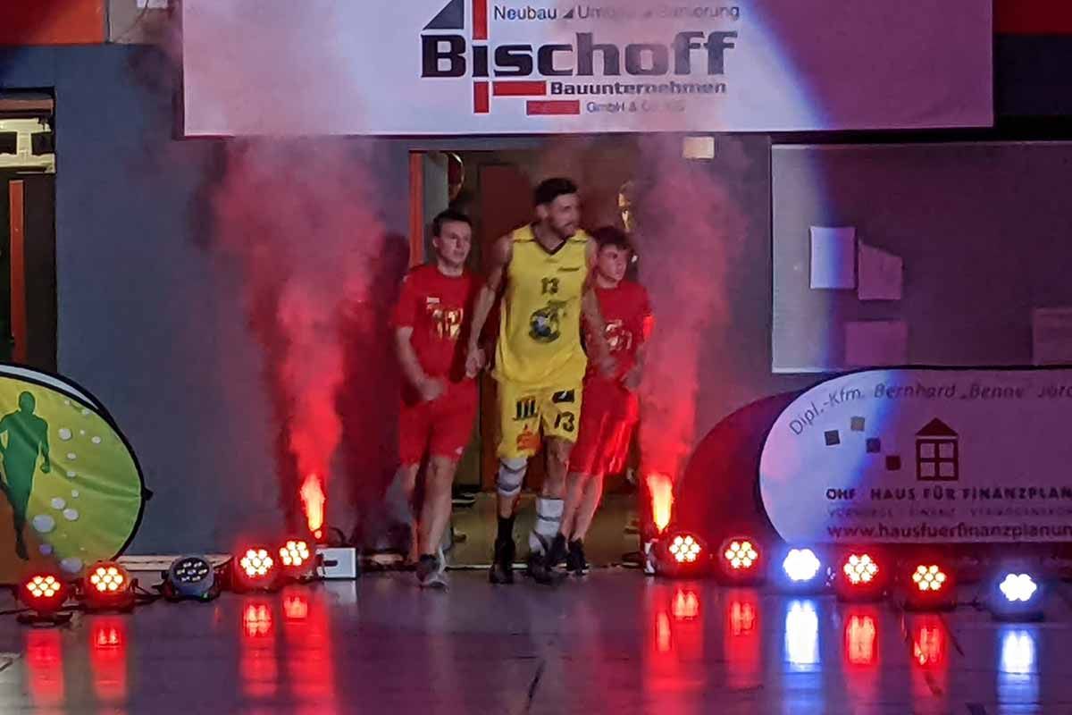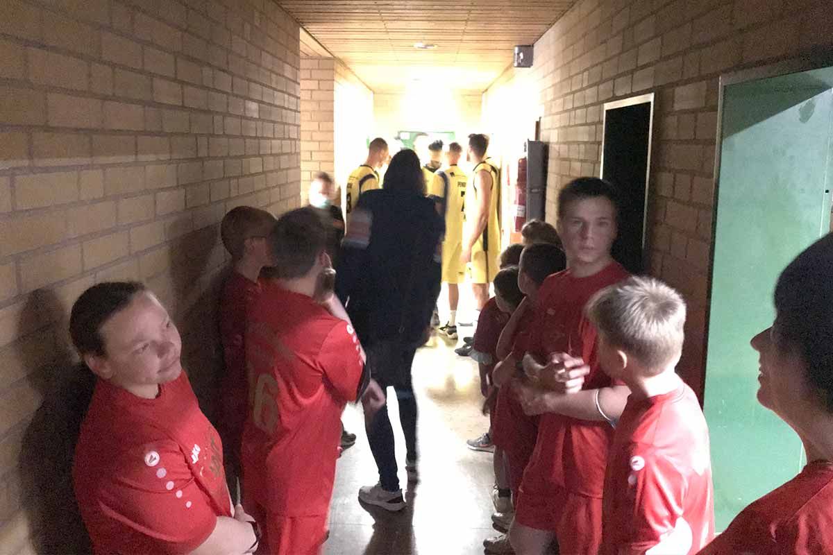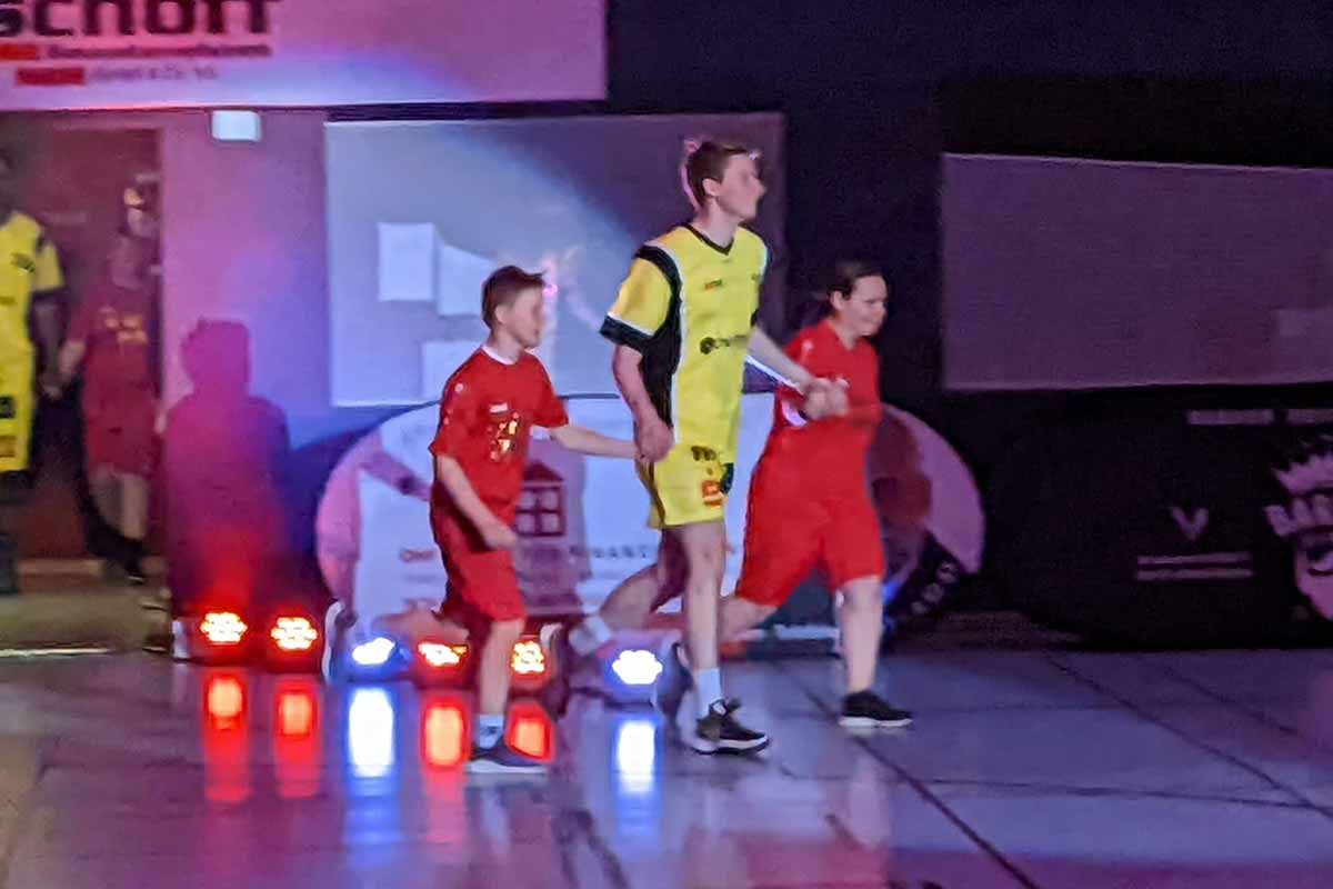Pünktlich um 19:00 Uhr war es dann so weit. Unsere Spieler liefen, begleitet von einigen von Antons Freunden, unter dem begeisterten Applaus der 499 Zuschauer Hand in Hand mit den "Bring it on Ballers" in die Halle ein. Die Beleuchtung wurde gedimmt, die Scheinwerfer erstrahlten, und Anton und seine Schwester Frida kamen als Erste, geführt von einem Basketballspieler des TVI, heraus. Nachdem alle Spieler eingelaufen waren, versammelten sich die TVI-Spieler um die Kickers, bildeten einen Kreis und stimmten sich lautstark auf das Spiel ein. Es war ein atemberaubendes Erlebnis für unsere Kickers.