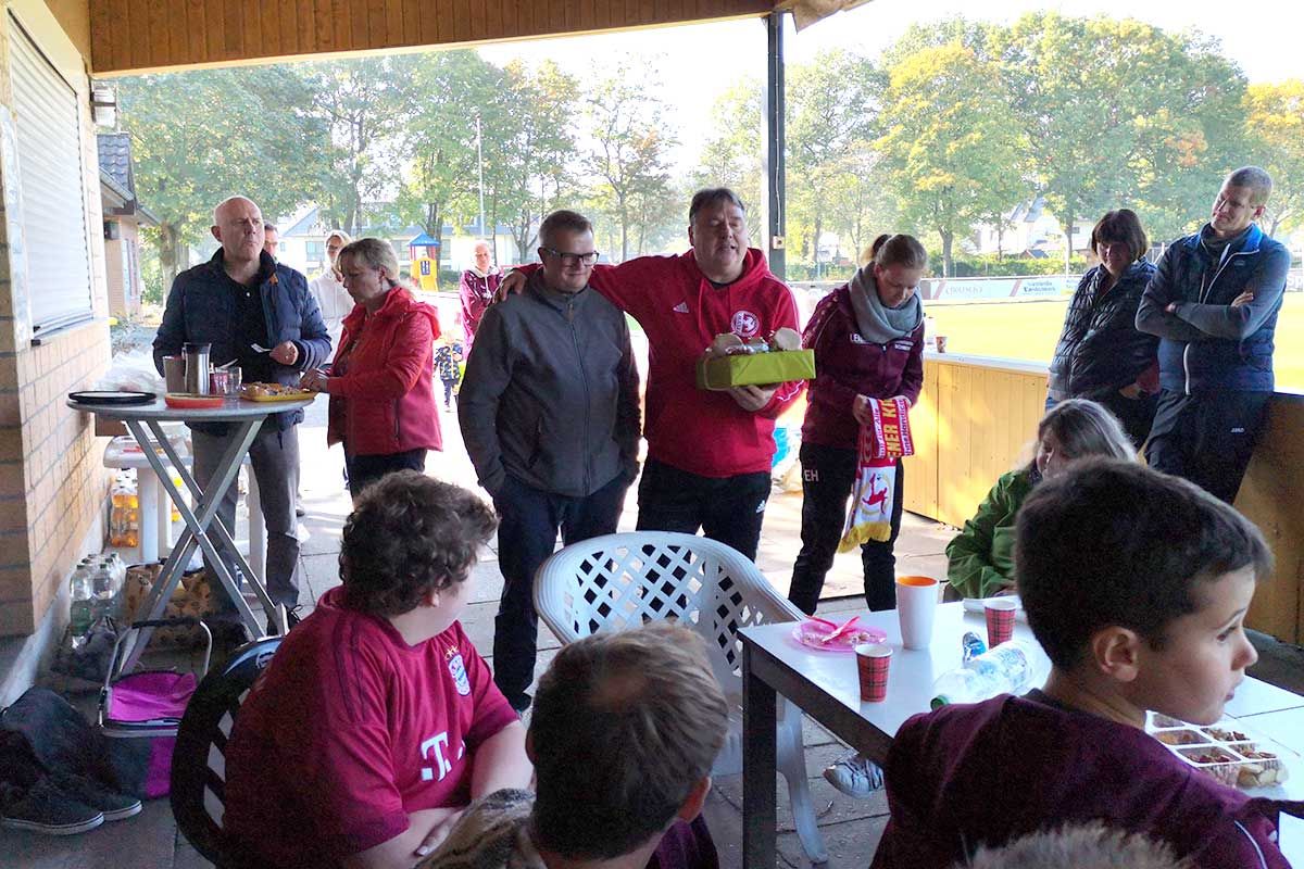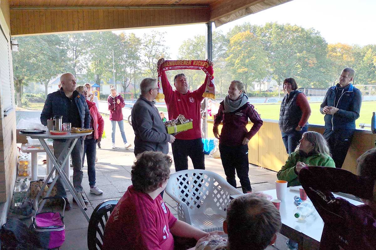 In dieser entspannten Runde nutzten wir die Gelegenheit, um uns bei Kai Ebbers für sein großes Engagement zu bedanken. Kai hatte den Kontakt zur SpVgg Vreden hergestellt und die Freundschaft mit Engin und der ersten Mannschaft der SpVgg Vreden erst ermöglicht. Als Zeichen unserer Dankbarkeit überreichten wir Kai einen Präsentkorb voller Leckereien und einen Fanschal der Ibbenbürener Kickers. Kai war angenehm überrascht und freute sich sehr über unsere Geste.