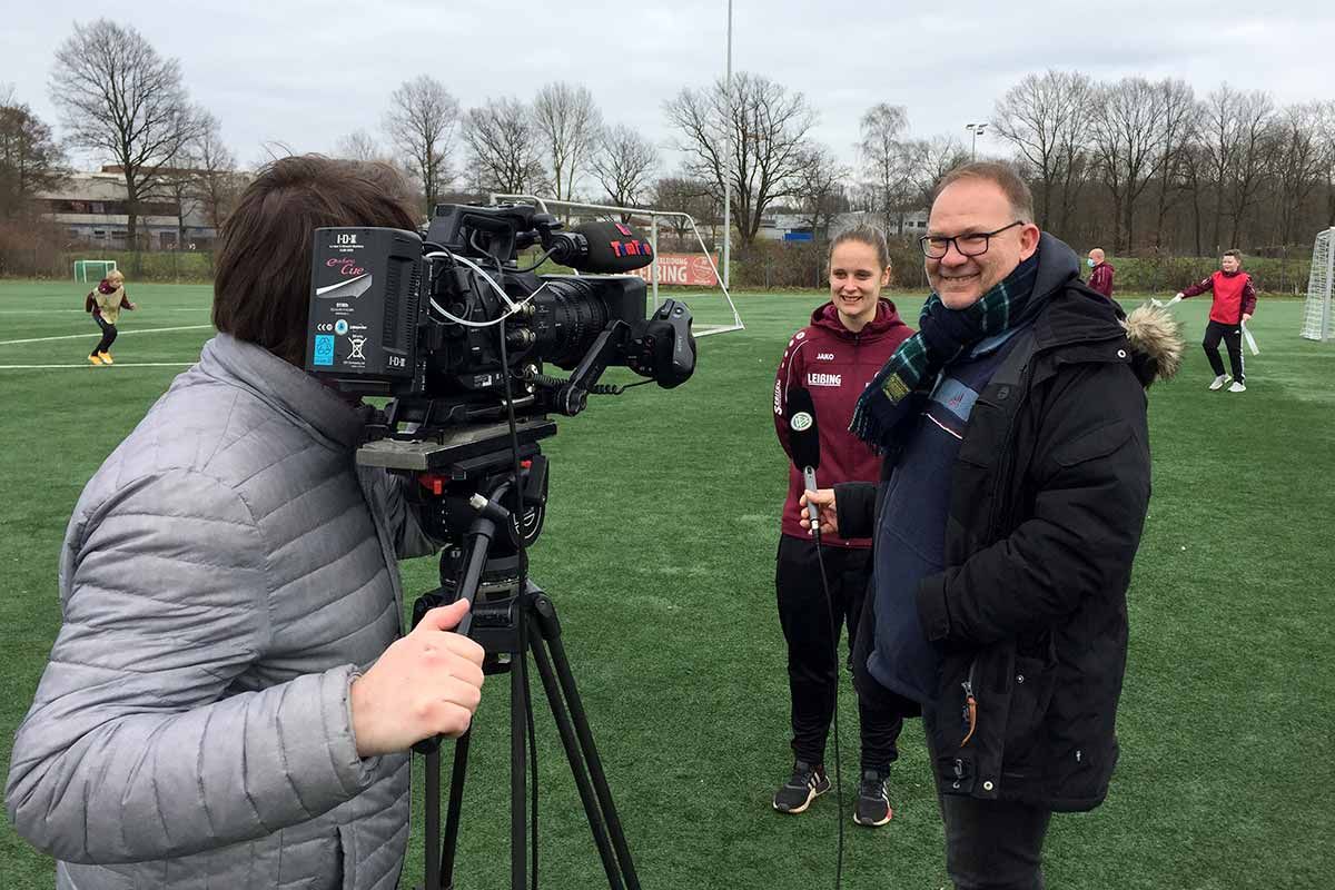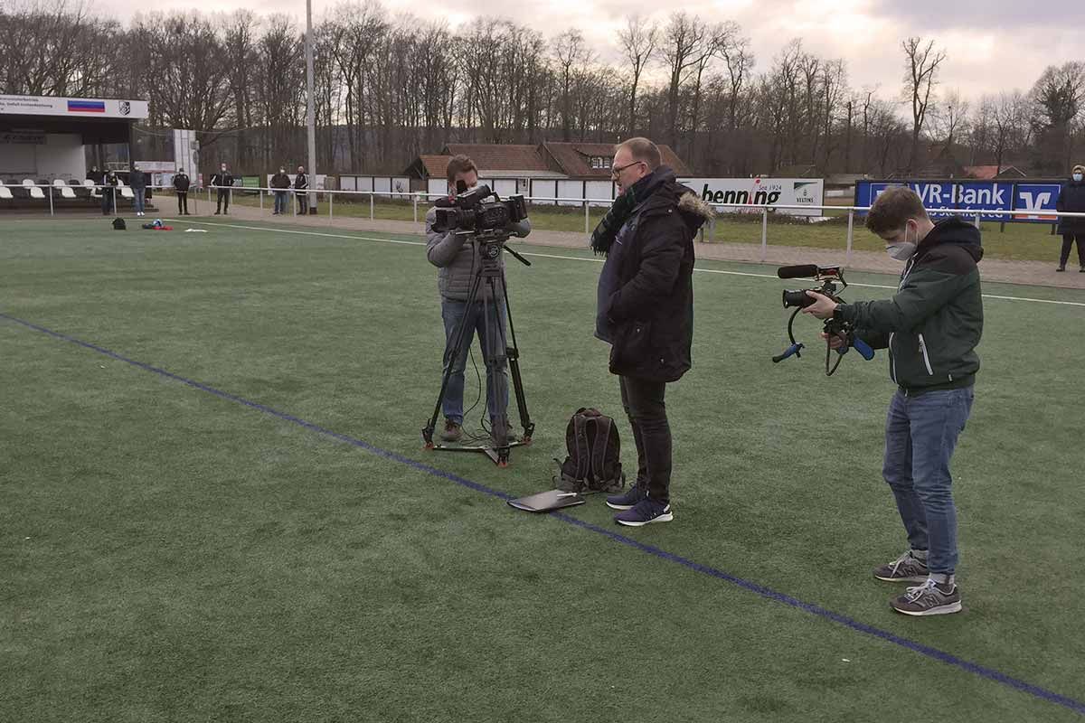 Als das Film-Team dann loslegte, stieg die Spannung bei allen Beteiligten noch einmal deutlich an. Überall wurde gefilmt – bei jeder Aktion, bei jeder Anweisung der Trainer an die Mannschaft war die Kamera dabei. Das war für Trainer, Spieler und Eltern sehr ungewohnt. Danach wurden Interviews mit Bürgermeister Dr. Marc Schrameyer, den Trainern Enrica, Franzi und Marcel, einigen Spielern und den Vereinsvertretern von Arminia Ibbenbüren, Cheruskia Laggenbeck, Ibbenbürener Spvg 08, SW Esch und SV Uffeln durchgeführt. Das Film-Team wollte außerdem gerne weiterhin beim Training filmen und die Gründung der Ibbenbürener Kickers mit den Vereinsvertretern nachstellen.